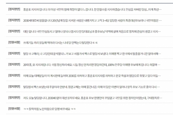 홍준표 후보 지지자로 보이는 네티즌은 국민의힘 홈페이지 게시판을 통해 “저도 오늘 탈당한다. 203040 없이 대선 잘 치르시라”면서 “구태정치로 청년의 희망을 짓밟았다. 정권교체는 당신들처럼 구태정치 좋아하는 6070 어르신들 데리고 많이 하시라”는 글을 남기며 “노인의힘으로 당명 바꾸세요.” 라며 비꼬는 글을 남겼다.