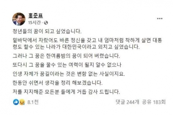 그는 "청년들의 꿈이 되고 싶었으나 그 꿈은 한여름밤의 꿈이 되어 버렸다"면서 "또다시 그 꿈을 꿀 수 있는 여력이 될지는 알 수 없으나 인생 자체가 꿈길이라는 건 변함없는 사실"이라고 덧붙였다.