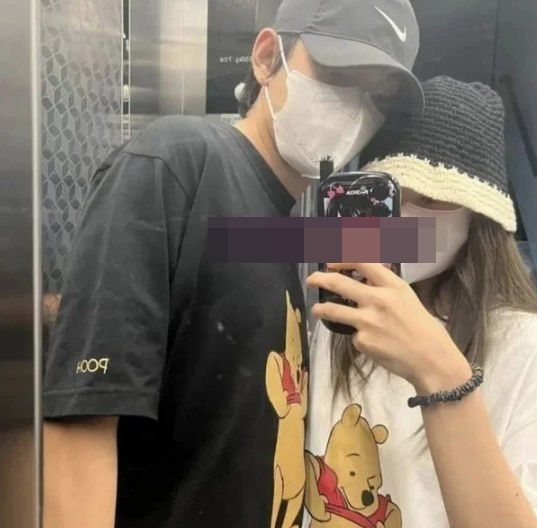 공개된 사진 속에는 뷔와 제니로 추정되는 남녀가 곰돌이 푸 캐릭터가 그려진 의상을 입은 채 엘리베이터 안에서 머리를 맞대소 셀카를 촬영하고 있다.